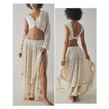 Yimoon Women's Floral Lace Long Skirts Elastic Asymmetrical Layered See-Through Maxi Skirts Sexy Sheer Flowy Beach Skirt(Beige-S)