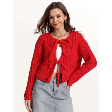 Yimoon Womens Tie Front Chunky Cardigan Sweater Cropped Long Sleeve Open Front Cardigan Knit Trendy Sweater Tops (Red-M)