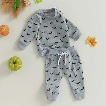 YINGISFITM Baby Girl Boy Halloween Outfits Bumpkin Spook Crewneck Sweatshirt Top Pants Set Toddler Neutral Fall Winter Clothes (Dark Gray-Bat, 18-24 Months)