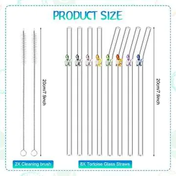 Show more Discover the perfect blend of style and functionality with these delightful turtle-designed glass straws. You’ll receive a total of 8 pieces: 4 straight and 4 bent styles, complemented by 2 handy cleaning brushes. This considerate combination not only meets your daily usage needs but also adds a fun twist to your party gatherings! Each straw features a charming turtle design in vibrant colors, making them an eye-catching addition to your drinkware collection.