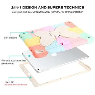 Show more This innovative iPad case is specifically designed for the Apple iPad 9th, 8th, and 7th Generation, as well as for the iPad Air 3, ensuring it's a perfect fit for your device. Made to protect against drops, bumps, and scratches, this case features a durable dual-layer design that combines a hybrid shockproof material with a hard PC cover and silicone outer layer. You can trust it to keep your iPad safe while you're on the go.