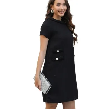 Show moreStep into sophistication with the Yioaga Women's Tweed Jackie Dress! This stunning bodycon mini dress is designed to offer elegance, comfort, and versatility, making it an essential addition to your wardrobe. Crafted from a soft and lightweight tweed fabric, this dress ensures you feel great throughout the day while radiating chic vibes at any occasion. With its classic crew neck and short sleeves, it beautifully combines timeless style with modern flair. The gold crest buttons add a touch of luxury, while the hidden back zip closure provides an effortless fit. Available in a sophisticated black color, this dress is perfect for dressing up or down, making it suitable for everything from workdays to weekend soirées.
