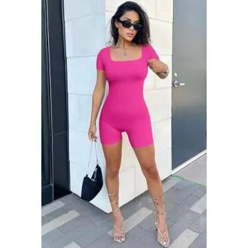 YIOIOIO Women's Short Sleeve Yoga Romper Seamless Ribbed Workout One Piece Square Neck Jumpsuit