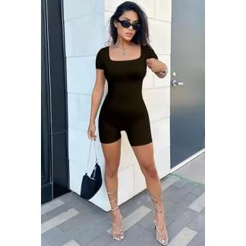 YIOIOIO Women's Short Sleeve Yoga Romper Seamless Ribbed Workout One Piece Square Neck Jumpsuit