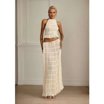 YISHATIER Women's Sheer Sets Backless Halter Tank Top and Pleated Retro Tulle Chiffon Maxi Skirt Sets See-through (M,Medium)