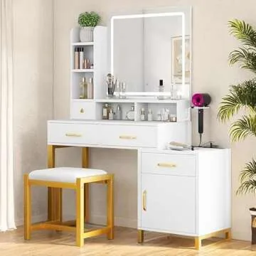 Show moreTransform your beauty routine into an enchanting experience with the YITAHOME 41.3'' Vanity Desk with Mirror and Lights. This exquisite makeup vanity set seamlessly combines aesthetics with functionality to meet all your beauty needs. Designed for modern living, it features a beautiful ivory white finish and a sleek mirror surrounded by adjustable LED lighting, providing a perfect backdrop for skincare rituals and makeup application. With ample storage solutions including four spacious drawers and five open shelves, this vanity is ideal for organizing cosmetics, hair tools, and accessories in style.