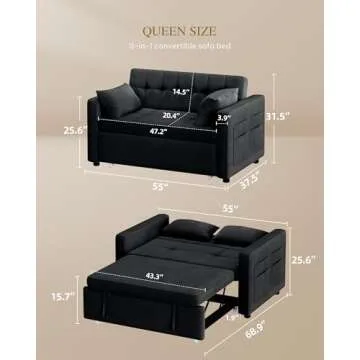 YITAHOME 55" Convertible Sofa Bed, Velvet Sleeper Sofa with Pull-Out Bed, 3-in-1 Futon Couch with Reclining Backrest and Side Pocket, Modern Loveseat for Living Room, Black, Full Size