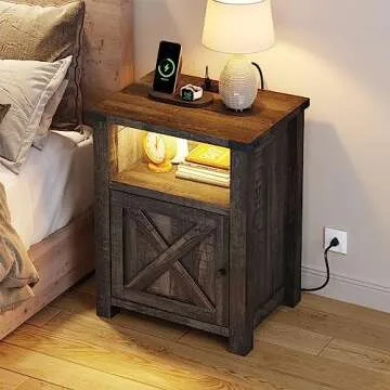 YITAHOME Farmhouse Nightstand with Charging Station & LED Lights, Nightstands Set of 2 Small Bedside Tables Set of 2, Side Tables Bedroom, Rustic Wood Night Stand, Brown Oak
