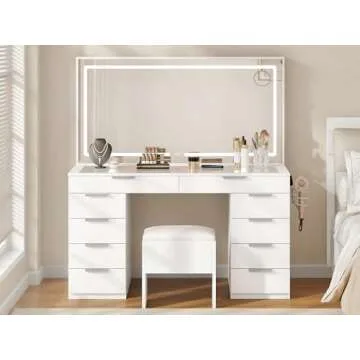 YITAHOME Makeup Vanity with Light Strip & Extra-Large Mirror, 10-Drawer Vanity Table Set with Power Hub & Hair Dryer Rack, Glass Top Vanity with 3 Color Modes Adjustment, Storage Bench for Bedroom