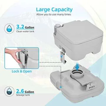 Show moreExperience unparalleled convenience on your next outdoor adventure with the YITAHOME Portable Toilet 2.6 Gallon Camping RV Potty. This portable toilet is specifically designed for camping, boating, and hiking, providing a reliable sanitation solution when you're far from modern amenities. Featuring a generous 3.2-gallon (12L) freshwater holding tank and a 2.6-gallon (10L) waste-water holding tank, this travel toilet can handle multiple uses before needing a clean, which saves you time and hassle while you enjoy the great outdoors.