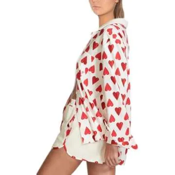 Show more Indulge in the cozy elegance of our Valentine's Day Pajamas for Women, a delightful blend of comfort and style. Made from super soft, skin-friendly fabric, these pajamas are designed to make you feel like you're wrapped in a gentle cocoon. The set includes a collared long sleeve button-down shirt and adorable elastic waist shorts, ideal for those who cherish comfort without sacrificing style. Adorned with charming floral heart prints, these pajamas embody the spirit of love and romance, perfect for the festive occasion.