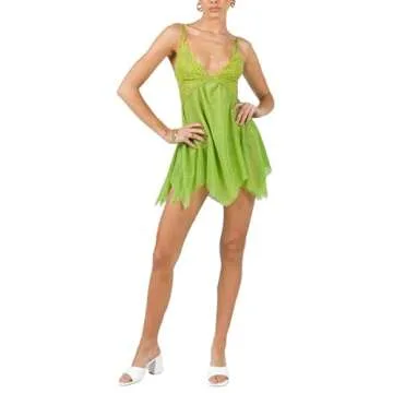 Show moreUnveil your enchanting side with the Yiulangde Womens Green Tinkerbell Fairy Costume Dress, a perfect combination of elegance and playfulness. Crafted from premium quality polyester, this ultra-soft and skin-friendly lace mini dress is designed for ultimate comfort and breathability. Ideal for Halloween parties, cosplay events, or romantic dates, this seductive ensemble features a unique design that allows you to express your inner fairy effortlessly. From its sexy low cut and backless sling style to the charming irregular hem, this dazzling dress captures the essence of whimsy and magic every time you wear it.