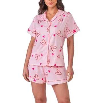 Show more Indulge in ultimate comfort and playful style with the Yiulangde Women’s Valentine’s Day Pajamas, a delightful two-piece set that embraces your body with soft luxury. Crafted from super soft and breathable satin fabric, these pajamas offer a delightful balance of coziness and elegance, perfect for snuggling or lounging all day. The set features a stylish long-sleeve button-down shirt adorned with an enchanting floral hearts print and a matching pair of tie-elastic waist shorts that promise a comfortable fit. Ideal for any occasion, whether you’re hosting a pajama party, celebrating love, or simply unwinding at home, this PJ set is designed with both charm and comfort in mind.