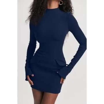 YMDUCH Women's Long Sleeve Mock Turtle Neck Bodycon Mini Tank Short Party Dress Navy