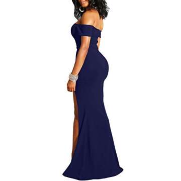 Show moreIntroducing the YMDUCH Women's Off Shoulder High Split Long Formal Party Dress Evening Gown in a stunning navy hue. This exquisite gown is designed for the modern woman who wants to make a statement at any event. With its floor-length silhouette and daring thigh-high slit, this dress effortlessly combines sophistication with a sultry edge. Crafted from a premium blend of polyester and spandex, the fabric not only drapes elegantly on the body but also provides a comfortable stretch that enhances your natural curves.