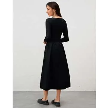 Ymejia Womens Long Sleeve Drop Waist Midi Dress Flowy Square Neck Slim Fit Casual A Line Long Dresses with Pockets Black