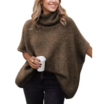 Ynhonra Womens Turtleneck Short Batwing Sleeve Sweater Knitted Oversized Chunky Dolman Tops(Brown-S)