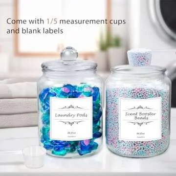 Show more Transform your laundry room and kitchen organization with this versatile set of glass jars! Each jar is not only aesthetically pleasing but also designed with functionality in mind. The set includes two 1/2-gallon empty glass jars equipped with lids, a pair of spoons featuring measurement markings, and blank labels for easy identification. With a wide mouth opening of 4 inches, these jars allow easy access whether you're scooping out sugar or washing out the inside. Crafted from durable, food-grade glass, they are lead-free and BPA-free, ensuring safety for all your stored items.