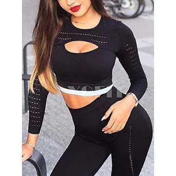 YOFIT Women's Workout Outfit 2 Pieces Seamless Yoga Leggings with Athletic Long Sleeve Cut Out Shirt Gym Clothes Set