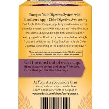 Show more Yogi Tea Blackberry Apple Cider Digestive Awakening Tea is your go-to organic solution for revitalizing your digestive health. This delightful blend features the harmonious combination of Apple Cider Vinegar and Ginger, creating a refreshing experience you can savor any time of the day. Supported by a hauntingly beautiful flavor of blackberry, this caffeine-free tea is perfect for those looking to improve their digestive wellness while enjoying every sip. With a convenient pack of 16 tea bags across 4 packs, it's an essential pantry item for both tea aficionados and health-conscious individuals alike.