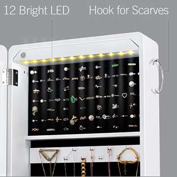 YOKUKINA Mirror Jewelry Cabinet Standing, Large Storage Jewelry Armoire, Full-Length Frameless Mirror with Jewelry Storage, 12 LED Lockable Standing Jewelry Organizer (White)