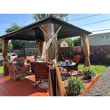 Show moreTransform your outdoor space with the YOLENY 10' x 13' Hardtop Gazebo, expertly designed to elevate your gardening and patio experience. Crafted from high-quality galvanized steel, this gazebo boasts not only a stylish appearance but also outstanding durability that is perfect for all seasons. Unlike traditional gazebos made from fabric or polycarbonate, the hard metal top of this gazebo is engineered to withstand heavy snow loads and offers unparalleled stability, even in windy conditions. It effectively blocks direct sunlight, ensuring that you enjoy the full shade while socializing or relaxing underneath your pavilion, making it an ideal gathering spot for family and friends.