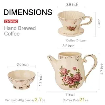 Show moreIndulge in the art of coffee making with the YOLIFE Pour Over Coffee Maker Set, a stunning vintage ceramic coffee dripper set adorned with elegant rose flowers and gold leaves design. This exquisitely handcrafted set not only delivers on functionality but also elevates the aesthetics of your kitchen. Made from high-quality ceramic, it stands out with its beautiful ivory yellow color, superb craftsmanship, and gold accents that promise to enhance your coffee brewing experience. With a pour-over capacity of 200ml, the filter cup is perfect for creating 1-2 cups of your favorite brew, while the accompanying 600ml coffee pot ensures you have enough to satisfy your coffee cravings.