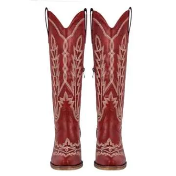 Yolkomo Cowboy Boots for Women Wide Calf Distressed Cowgirl Boots Square toe Low Heel Embroidered Western Boots Pointed Toe Pull-On Leather Mid-Calf High Boots Red Size 10