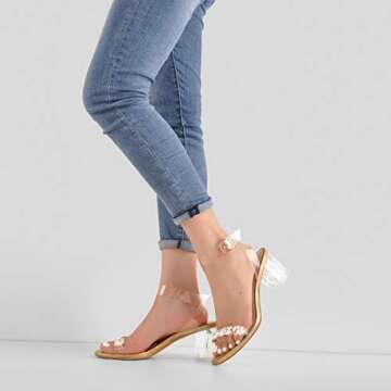 Step effortlessly into glamorous comfort with the Yolkomo Women’s Gold Rhinestone Chunky Heel Sandals. These stylish pumps elegantly blend fashion and function, boasting a delightful 6cm chunky heel that makes them perfect for any occasion, from chic dinners to joyful celebrations. Designed for those who appreciate both aesthetic appeal and reliability, these sandals feature a clear block heel that artfully catches the light and adds that extra touch of elegance to your outfit.
