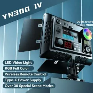 Show more Illuminate your creative vision with the YONGNUO YN300 IV LED Video Panel Light. This advanced lighting solution is designed specifically for content creators, photographers, and videographers who demand flexibility and quality. Featuring a powerful combination of 316 high CRI LED beads and 60 RGB full-color SMD lights, it provides a spectrum of vivid lighting effects to enhance your projects. Whether you're shooting in a controlled studio or a dynamic environment, this panel light offers a reliable range of color temperatures from 3200K to 5600K, allowing you to match the ambiance perfectly.