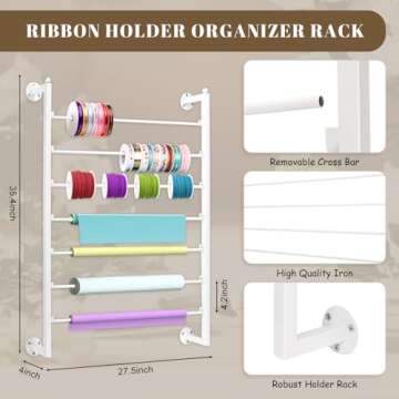 The ribbon holder features a unique multi-tier design with 7 cross bars, each with a diameter of 0.4 inches. This innovative layout allows for easy access and quick replenishment or replacement of ribbons. No more tangled mess or searching endlessly for the right shade! Enjoy an organized space where creativity can flourish and inspire.