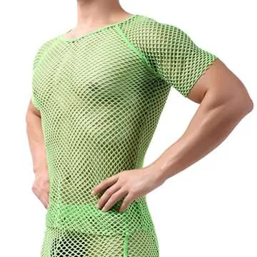 Show moreRevamp your nightwear collection with the YOOBNG Sexy Men's T-Shirt Mesh Fishnet Short Sleeve Undershirt. Crafted from a blend of 88% Polyester and 12% Polyurethane, this innovative design features a unique mesh construction that ensures maximum breathability and comfort. The short-sleeved, hollow-out design not only accentuates your physique but also adds an alluring flair to your sleepwear or casual outfits. Available in a striking green color and tailored specifically for comfort, this undershirt is not just functional but also plays a pivotal role in elevating your style quotient.