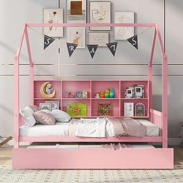 YOPTO Full Size House Bed with Trundle,Pine Wood Playhouse Bed Frame W/Storage Shelf,Front and Rear Guardrails,No Box Spring Needed,Easy Assembly,for Kids,Boys,Girls