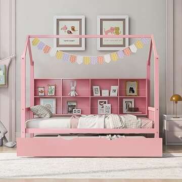 YOPTO Twin Size House Bed with Trundle,Pine Wood Playhouse Bed Frame W/Storage Shelf,Front and Rear Guardrails,No Box Spring Needed,Easy Assembly,for Kids,Boys,Girls