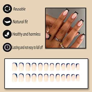 Show more Transform your nail game with the YOSOMMK French Press on Nails, the ultimate solution for achieving glamorous nails in just minutes! This exquisite set features 24 stylish press-on nails in a chic short black square design, perfect for those looking to make a bold statement. Each set is thoughtfully curated with a variety of sizes, ensuring a perfect fit for every nail shape and size. Made from high-quality ABS material, these fake nails not only look stunning but are also durable and elastic, allowing for a comfortable, natural feel when worn. Experience salon-quality results without the long wait and hassle of traditional nail polish!