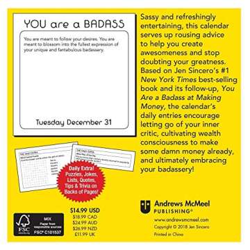 What sets the You are a Badass 2019 Day-to-Day Daily Desk Boxed Calendar apart from other daily calendars is its unique focus on positivity and empowerment directly from the great insights of Jen Sincero. Unlike standard calendars filled with generic quotes, this one is curated to inspire true self-love and confidence. While many calendars are purely functional, this one delivers a motivational punch, making it a smaller investment for a larger personal impact. It’s a daily reminder of your potential, as opposed to just being a keepsake for dates.