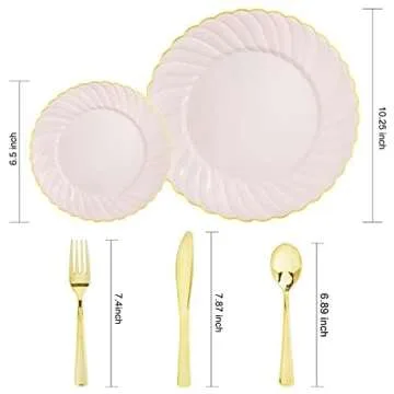 YOUBET 125Pieces Pink Plastic Plates with Gold Rim-Gold Plastic Silverware Include 25 Dinner Plates 25 Dessert Plates 75 Gold Silverwares for Wedding Birthday & Parties