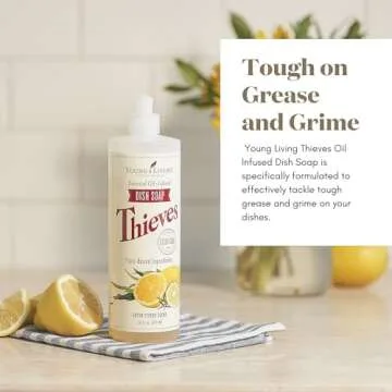 Show more Introducing the Young Living Thieves Oil Infused Dish Soap — a revolutionary dishwashing solution that masterfully combines powerful cleaning capabilities with an enjoyable, fragrant experience! This premium dish soap, available in a convenient 12 fl. oz size, is expertly crafted to tackle even the toughest grease and grime, ensuring your dishes come out sparkling clean with minimal effort. Infused with Thieves premium essential oil blend, along with the invigorating scents of Jade Lemon and Bergamot, it leaves not only your dishes but also your kitchen smelling refreshingly citrusy.