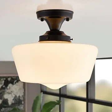 Illuminate your space with the stunning youngrender Black Schoolhouse Light Fixture, an exquisite blend of vintage charm and modern functionality. Measuring at 11.81" D x 11.02" H, this expertly crafted flush mount ceiling light features a durable body finished in a sleek black, paired beautifully with a milky white antique-style glass shade. Perfectly suited for any room, whether it be a contemporary kitchen, cozy hallway, or sophisticated dining area, this light fixture...