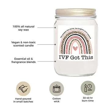 Show more Experience tranquility and positivity with our exclusive IVF Encouragement Candle Gifts, crafted especially for those navigating the emotional journey of infertility. These beautifully hand-poured candles are a source of comfort and support, with uplifting messages that serve as gentle reminders of hope. Infused with a delightful blend of Lavender & Vanilla, the calming scents are designed to soothe the spirit and raise the mood during challenging times. Perfect as infertility gifts for the women in your life, whether it be a sister, best friend, coworker, or even your beloved wife or girlfriend.