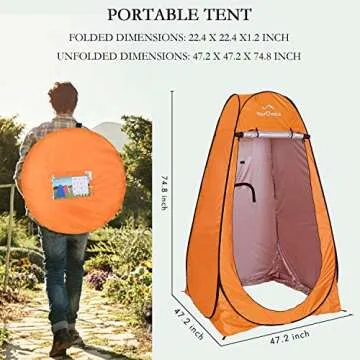 Show more The Your Choice Pop Up Shower Tent is an essential addition to any outdoor enthusiast's gear. With a quick and effortless setup, this tent requires no assembly and can be folded down or erected within 10 seconds. It features a durable, rust-proof steel frame reinforced by 4 stakes and supporting ropes for unmatched stability in all conditions. Measuring 47.2x47.2x74.8 inches when unfolded and only 22.4x22.4x1.2 inches when folded, this lightweight tent, weighing only 5.5 lbs, comes with a convenient carry bag for easy transportation.