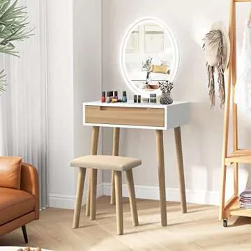 Show moreIntroducing the ultimate Intelligent Touch Screen Mirror Vanity Table, designed to elevate your makeup routine and home decor. This stunning 24-inch wide dressing table is tailor-made for small spaces, making it an ideal choice for apartments or cozy bedrooms. The charming LED lamp surrounding the mirror features adjustable lighting options—natural light, warm light, and cool light—allowing you to customize your illumination based on the scene and makeup style. Never again will you struggle to find the perfect light for your daily beauty rituals!