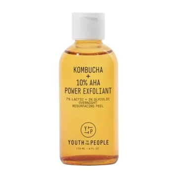 Show more Introducing the 10% AHA Exfoliant Kombucha Toner, a revolutionary overnight leave-on liquid face peel designed to unveil brighter, smoother-looking skin. This exceptional product boasts a potent blend of 7% lactic acid and 3% glycolic acid, scientifically formulated to refine your skin's texture while providing a deep clean.