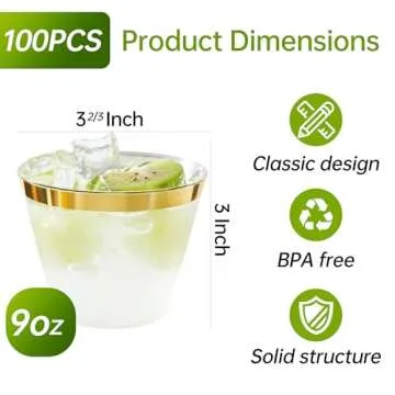 Show more Introducing the ultimate solution for your party needs: our 100 pcs 9 oz Heavy Duty Gold Rimmed Plastic Cups. Crafted from 100% food-grade plastic, these cups boast a hard and durable polystyrene material that ensures both strength and safety for all your beverage needs. With an exquisite gold rim, these cups bring an air of sophistication to your gatherings, making them perfect for both casual and formal events.