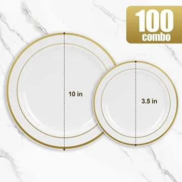 Show more Introducing the YOUTHSHIP 100 Pcs Plastic Plates With Gold Rims, an exquisite solution for all your dining needs! This elegant set includes 50 dinner plates measuring 10.25 inches and 50 salad plates at 7.5 inches, making it perfect for any occasion—from intimate dinners to grand celebrations. Crafted with care, these plates are designed to elevate your dining experience while providing the convenience of disposable tableware.