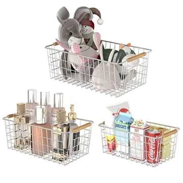 Show more Introducing the ultimate solution for keeping your living spaces organized and tidy: this 3-pack storage basket set is a must-have for every household. Crafted with sturdy steel wire and a rust-resistant coating, these baskets are built to last, ensuring long-term durability and functionality. Each pack includes three different sizes: a large basket (15.5 x 9.6 x 5.7 inches), a medium basket (14.1 x 12 x 5.1 inches), and a small basket (11.6 x 9.5 x 4.6 inches), catering to various storage needs in small or large spaces alike.