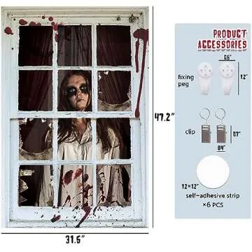 Show more Transform your home into a spine-chilling fright fest with the YOYOJOY Scary Halloween Window Decorations. Designed to maximize the spooky spirit of Halloween, this hauntingly beautiful curtain features a sinister female ghost pattern that will send shivers down the spine of trick-or-treaters and guests alike. At an impressive size of 31.5 inches wide and 47.2 inches high, this polyester fabric curtain drapes elegantly, creating a terrifying atmosphere that's sure to evoke gasps and awe. Durable and made to withstand varying weather conditions, you can use this curtain year after year to create lasting Halloween memories. Easy installation is a breeze thanks to built-in metal ring holes and included hanging accessories, so you can focus on scaring rather than struggling with setup.
