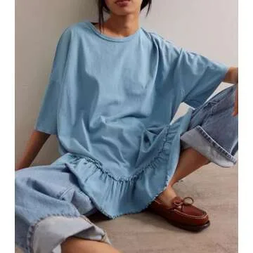 Yozazzy Womens Oversized Tee Shirt Casual Short Sleeve Ruffle Hem Shirts Loose Crew Neck Summer Tops(Blue-M)
