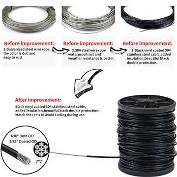 Show more Transform your outdoor spaces with the **YQL Outdoor Lights Hanging Kit**, a thoughtfully designed solution for showcasing your beautiful string lights. Made from durable 304 stainless steel with a black vinyl coating, this kit boasts maximum strength, weather resistance, and waterproof features. With a robust max load of **368lb**, you can effortlessly hang lights in your garden, patio, or backyard party. Measuring **82 feet** in length, the cable can be easily trimmed to suit your specific needs, making it a versatile option for various installations.