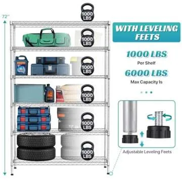 Designed with heavy-duty steel, the shelving unit promises outstanding durability, effectively resisting rust and oxidation. Each robust shelf has an impressive weight capacity of 1,000 lbs, summing to an eye-watering total capacity of 6,000 lbs when weight is evenly distributed. When using wheels, each shelf is still capable of supporting up to 100 lbs, ensuring that your items stay secure and your space remains organized.